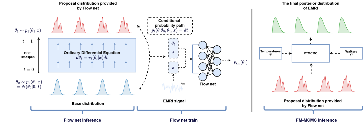 近期,力学所引力波实验中心研究团队在美国科学促进会与 中国科协合作的国际顶级期刊《Research》(IF:10.3)上发 表了题为“Towards Efficient and Accurate EMRI Parameter Estimation: A Machine Learning-Enhanced MCMC Framework” 的研究成果。该研究提出了“流匹配马尔可夫链蒙特卡洛” (Flow-Matching Markov Chain Monte Carlo, FM-MCMC)混 合计算框架,创造性地将生成式 AI 中的流匹配技术与传统的 并行回火 MCMC 算法深度融合,显著提升了极端质量比旋近 (EMRI)信号参数估计的效率与精度。