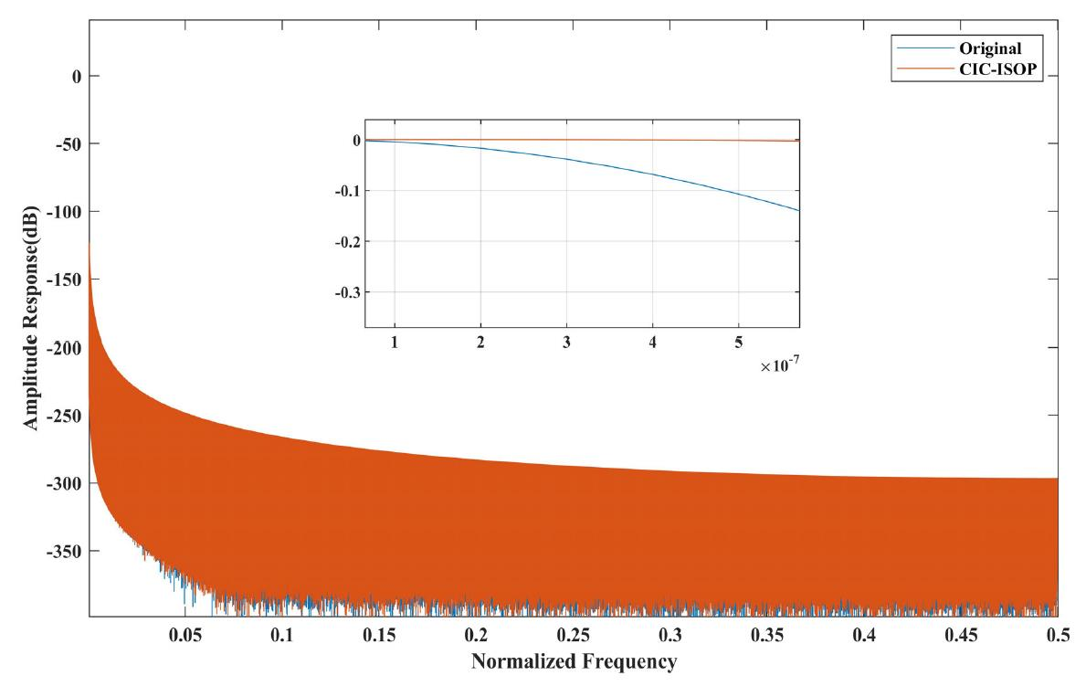 在空间引力波探测中,级联积分梳状(CIC)抗混叠滤波器总 是被用于相位计的抗混叠降采样。然而,CIC 滤波器的通带并不 平坦,这意味着不同频率下的衰减不同。因此,在需要对相位真 值高精度测量的领域,如差分波前传感(DWS),传统的降采样方 法并不适用。近日,力学所研究团队采用一种基于 CIC 插值二阶 多项式(ISOP)架构的滤波器,用于补偿衰减效应。