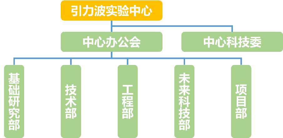 引力波实验中心设有中心办公室及中心科技委,并且拥有基础研究部、技术部、工程部、未来科技部、项目部等5个部门。